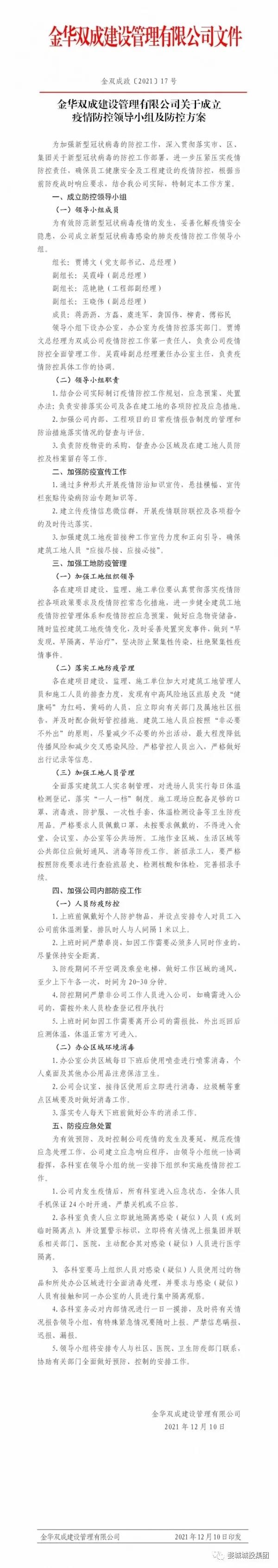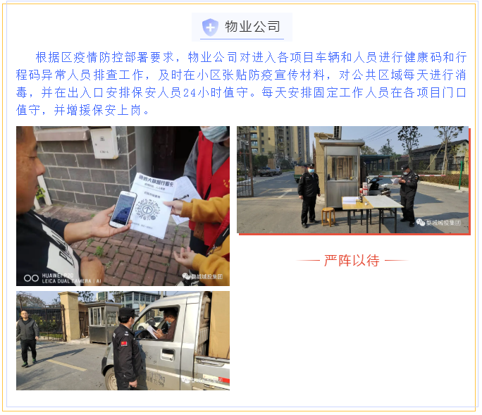 繼省、市、區(qū)疫情防控工作視頻會議召開后,婺城區(qū)城投集團深刻認識到疫情防控形勢的嚴峻性、復雜性、緊迫性,從“平時”模式轉(zhuǎn)入“戰(zhàn)時”機制,12月11日,集團全面部署、立即落實,第一時間印發(fā)《關于進一步健全完善疫情防控工作體系的通知》,制定《金華市婺城區(qū)城鄉(xiāng)建設投資集團有限公司疫情防控督查表》,在周末全員不休,集中精力開展重點項目和主要場所疫情防控攻堅的基礎上,組織其余干部職工前往聯(lián)系社區(qū),會同社區(qū)工作人員開展疫情防控工作,壓緊壓實責任,以鐵的擔當、鐵的紀律對疫情防控工作進行再細化、再落實,一鼓作氣堅決打贏這場疫情防控阻擊戰(zhàn)。