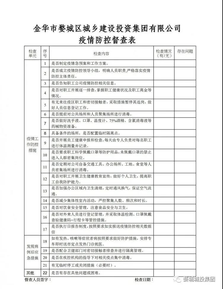 一是由集團疫情防控工作領(lǐng)導小組常務(wù)副組長陳中山牽頭成立督導檢查組,下設(shè)4個督查小組,督導小組成員放棄周末休息時間、不舍晝夜分赴在建工地、物業(yè)小區(qū)、文旅項目、高速路口、醫(yī)院門崗等重點區(qū)域督導檢查集團疫情防控工作落實情況,重點督導檢查領(lǐng)導批示指示要求、重點工作、防控措施和應(yīng)急預案的落實情況,認真組織核查并及時報送防控核查信息。二是完善修訂《集團疫情防控規(guī)范及工作制度》、《集團疫情防控督查表》,明確工作職責、強化規(guī)范管理,確保督查效率。三是督促建立健全疫情防控臺賬,明確督查重點,狠抓任務(wù)落實。