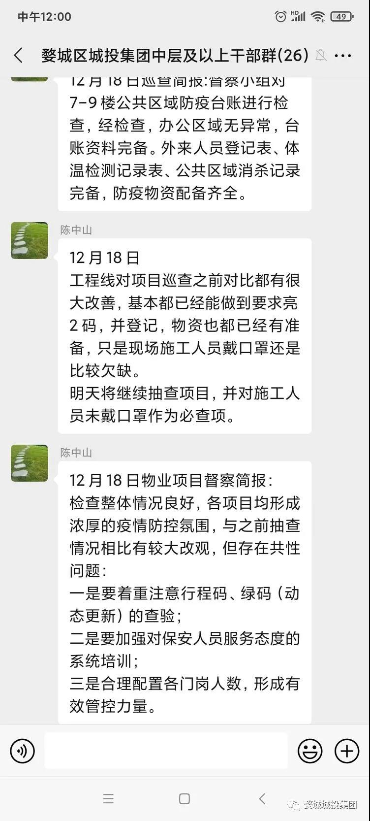 一是由集團疫情防控工作領(lǐng)導小組常務(wù)副組長陳中山牽頭成立督導檢查組,下設(shè)4個督查小組,督導小組成員放棄周末休息時間、不舍晝夜分赴在建工地、物業(yè)小區(qū)、文旅項目、高速路口、醫(yī)院門崗等重點區(qū)域督導檢查集團疫情防控工作落實情況,重點督導檢查領(lǐng)導批示指示要求、重點工作、防控措施和應(yīng)急預案的落實情況,認真組織核查并及時報送防控核查信息。二是完善修訂《集團疫情防控規(guī)范及工作制度》、《集團疫情防控督查表》,明確工作職責、強化規(guī)范管理,確保督查效率。三是督促建立健全疫情防控臺賬,明確督查重點,狠抓任務(wù)落實。